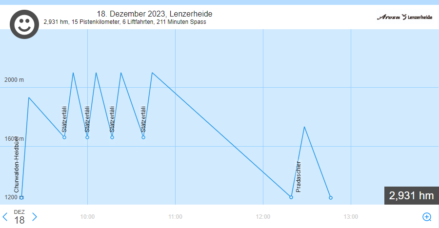 Leider hatte die 6er-Sesselbahn Stätzerhorn ein technisches Problem und konnte keine Personen transportieren. Somit hatte es dann viele Personen an der 4er-Sesselbahn Stätzertäli. Dadurch haben wir uns dann für das Gebiet Erlebnisberg Pradaschier entschieden. Das war aber auch nicht eine gute Entscheidung, da es auch in diesem Gebiet viele Personen hatte, die die gleiche Idee hatten. Darum sind wir dann an diesem Tag nur zwei Mal Stätzertäli und ein Mal Pradaschier gefahren.