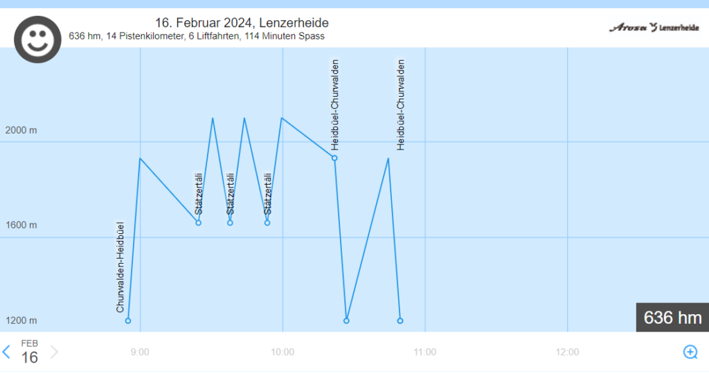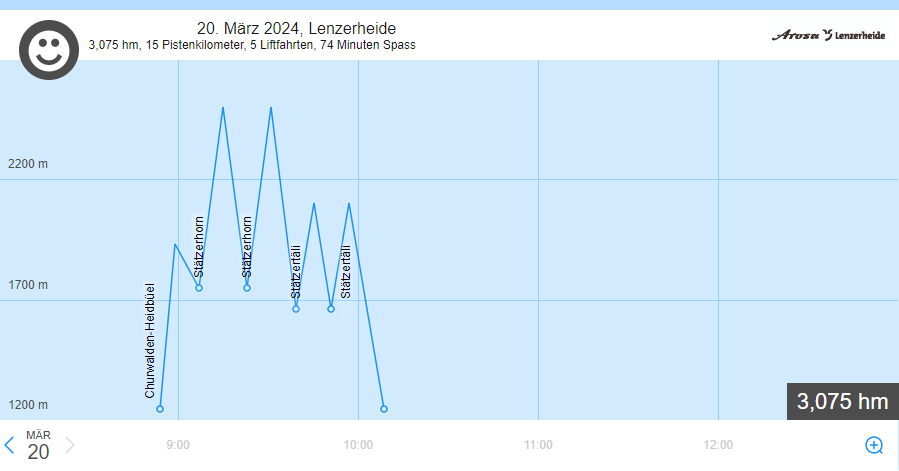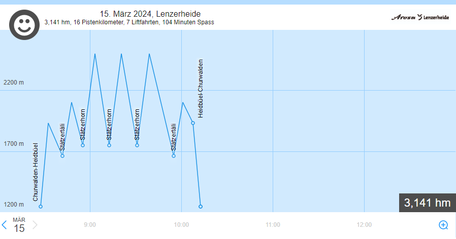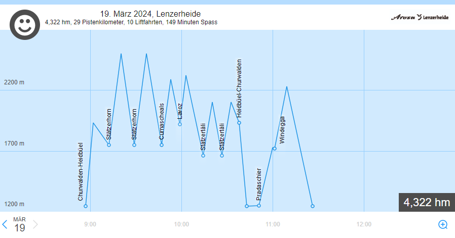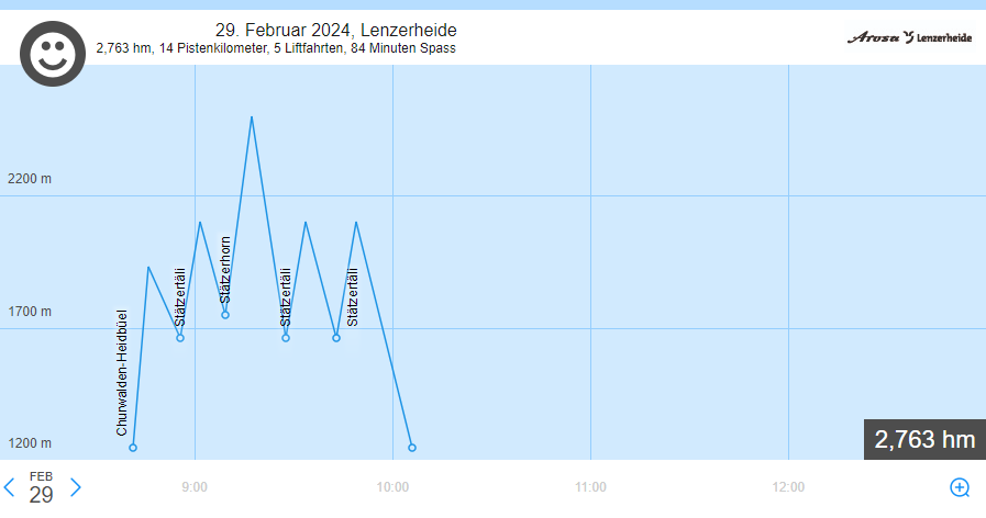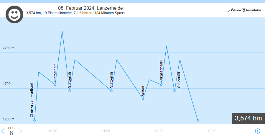 Die Temperatur auf der Anzeigetafel Churwalden zeigte beim Einstieg -3 °C und bei der Rückkehr +8 °C an. Am frühen Morgen waren fast keine Personen auf der Piste, aber da nun Schulferienzeit ist von einigen Kantonen, änderte sich das schnell.