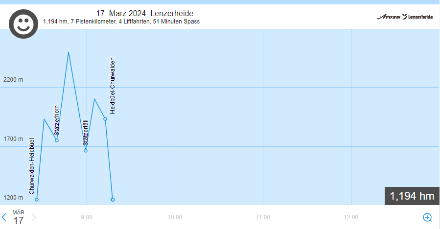 Heute nahmen wir als Einstieg die Panoramabahn Heidbüel und fuhren noch vier weitere Male mit der 4er-Sesselbahn Stätzertäli. Für die Rückfahrt nach Churwalden benutzen wird die Pisten 70b, 70c und 79 via Talstation Skilift Proschieri.