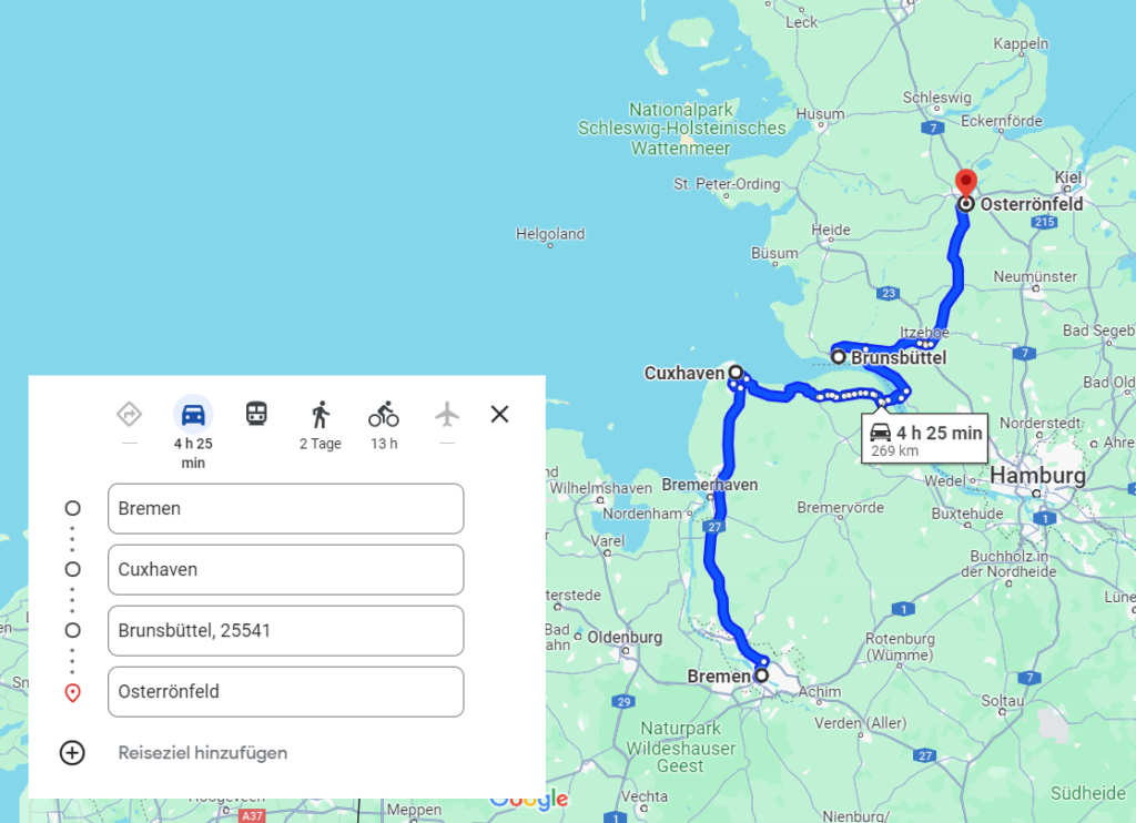 An den Google-Karten siehst du unsere zurückgelegte Fahrtstrecke.
