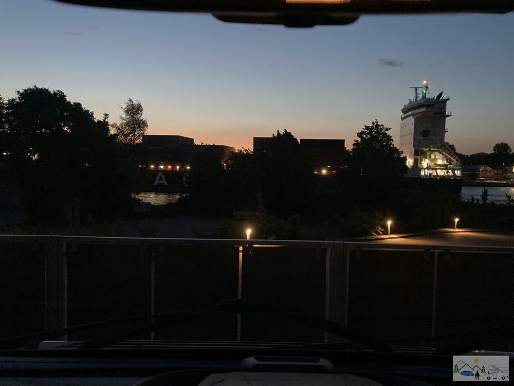 Um 11 Uhr fuhren wir am Platz vor und welches Glück, wir hatten Platz. Zuoberst platzierten wir uns. Die 1. Reihe war leider besetzt. Die 2. Reihe fanden wir nicht so toll, da es grosse WoMo’s davor hatte. Die oberste Reihe ist länger als die anderen und so hatten wir nichts vor uns. Kaum da, fuhren schon grosse Schiffe vorbei. Einfach toll und ein super Feeling. Morgen soll gemäss Plan, anscheinend das Traumschiff Amadea durchfahren, bin mal gespannt. Leider erwies sich dieser Hinweis von einem Camper-Kollegen als falsch. Macht nichts, wir sahen viele andere grosse Schiffe.