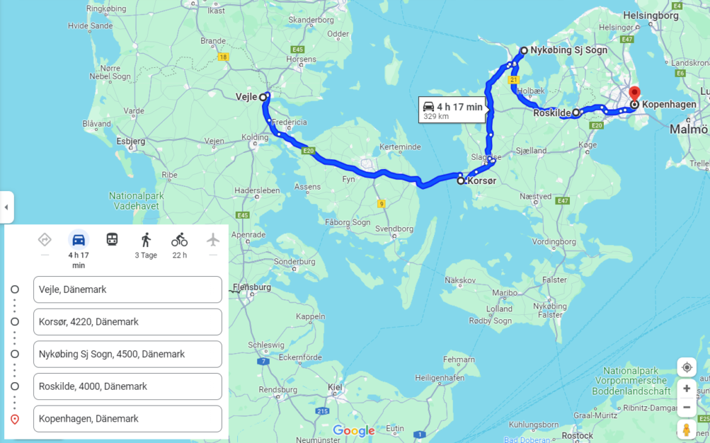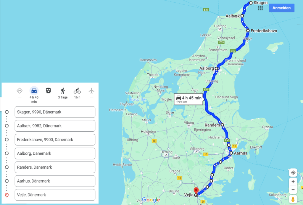 Die Fahrt verlief gut und es hatte wenig Verkehr. Auf der Gegenseite war es aber anders, vor allem viele Wohnwagen und Camper kamen uns entgegen. Am Zollübergang Deutschland-Dänemark wollte „Niemand“ was von uns.