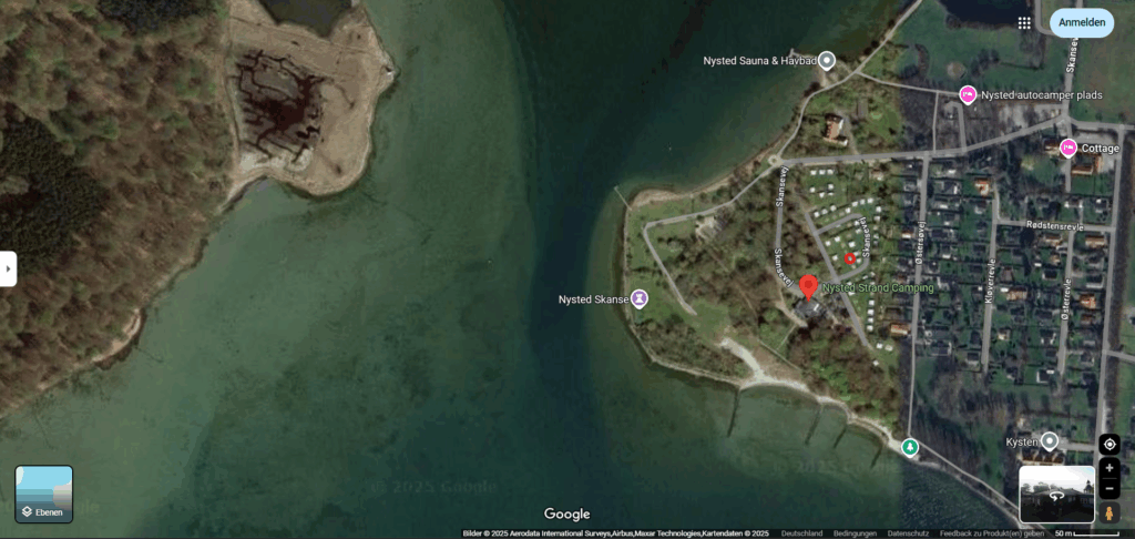Kurz nach der Überfahrt, die Anita gut überstanden hat, steuerten wir den Camping Nysted an. Eigentlich wollten wir am Hafen auf den Stellplatz. Dort war alles abgesperrt und eine Baustelle. So entschlossen wir uns für den Camping im Ort.