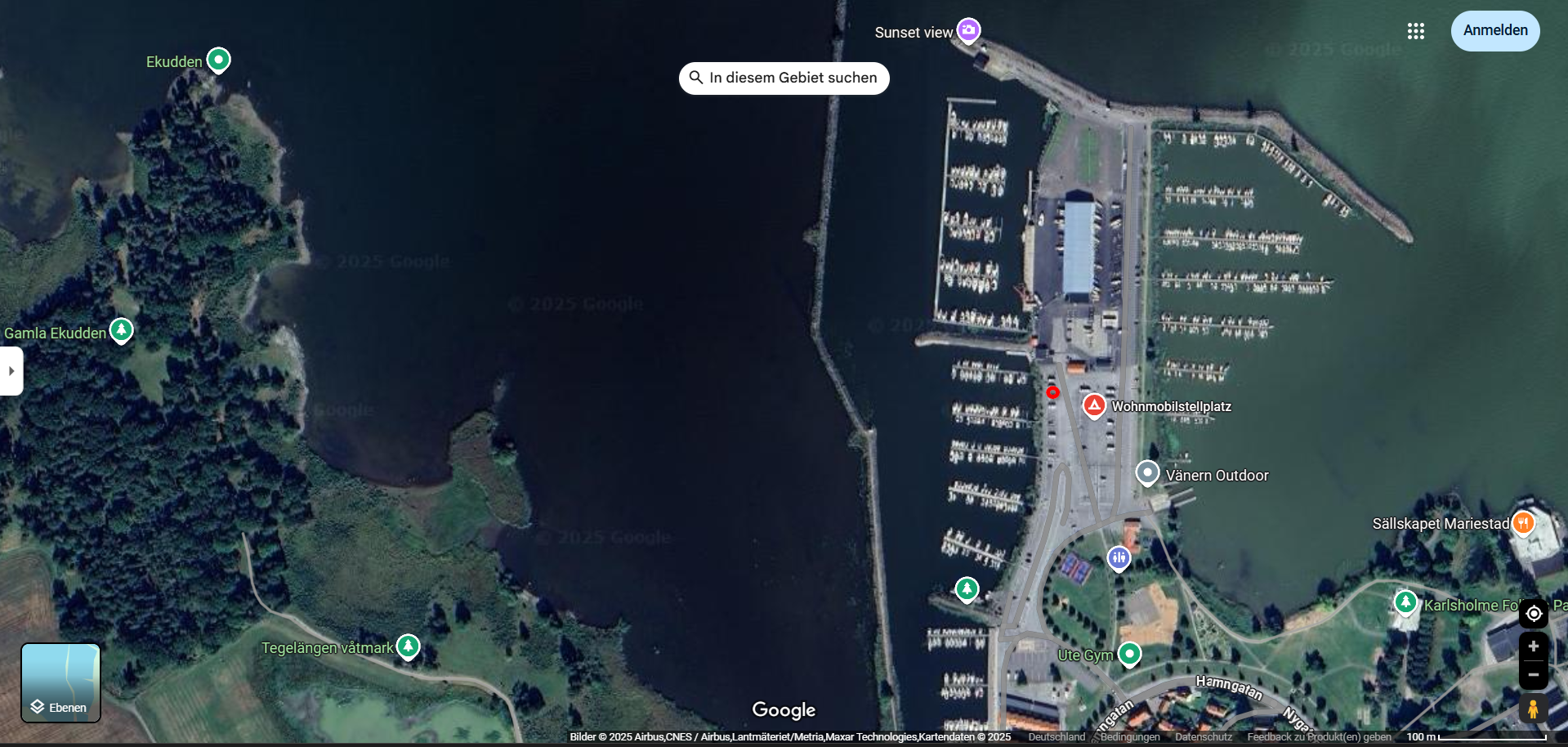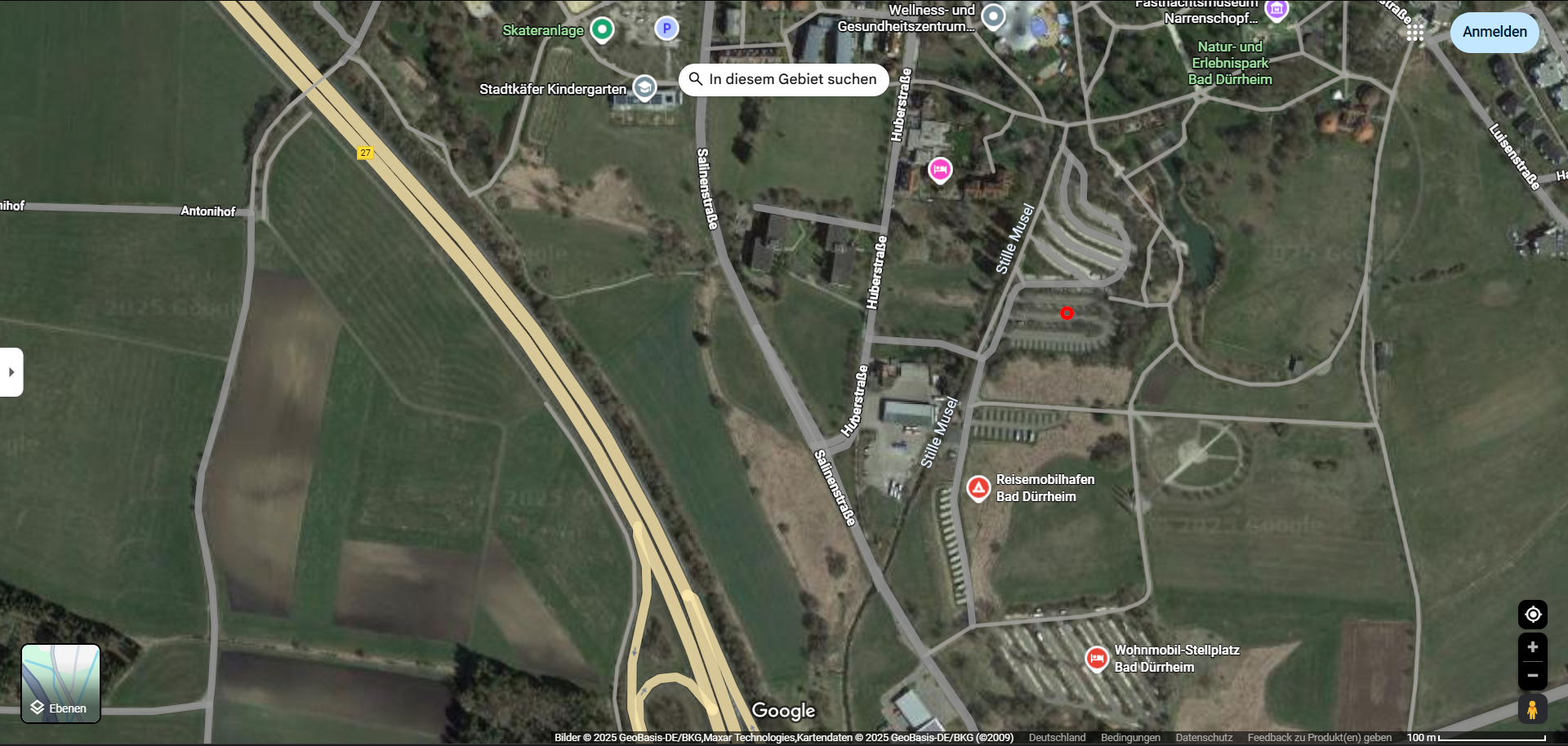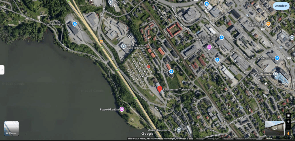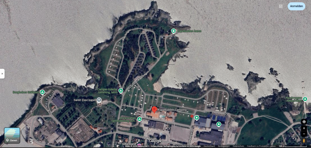 An den Google-Karten „Gelände“ siehst du unsere zurückgelegte Fahrtstrecke und an den Google-Karten „Satellit“ siehst du unseren benutzten Übernachtungsplatz (roter Kreis) auf dem jeweiligen Stellplatz / Campingplatz.