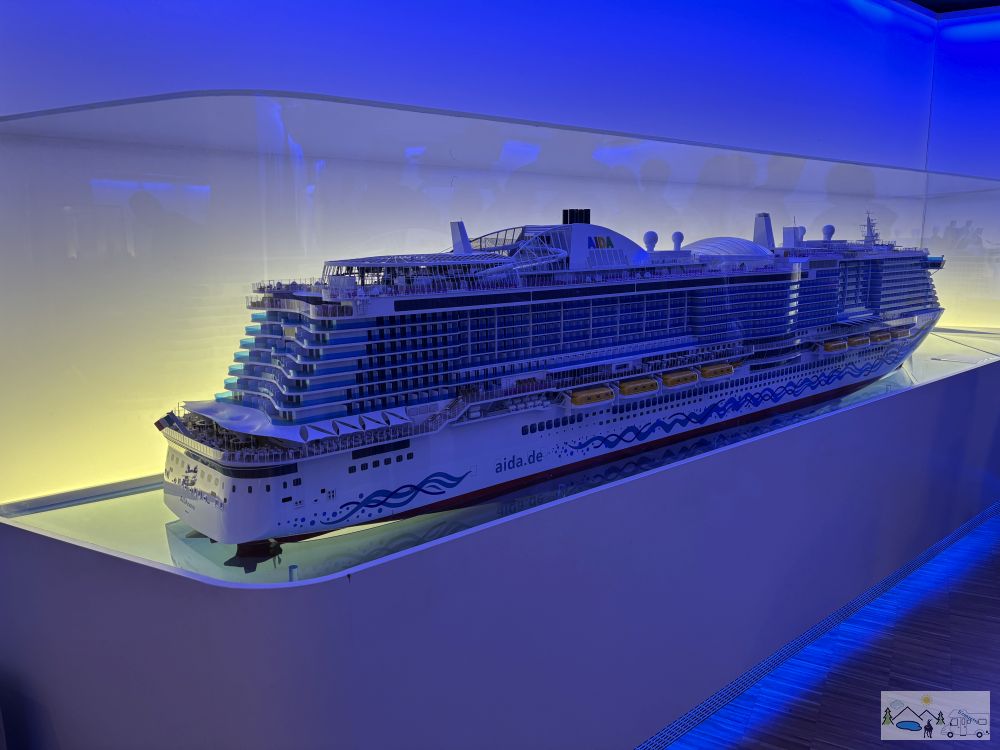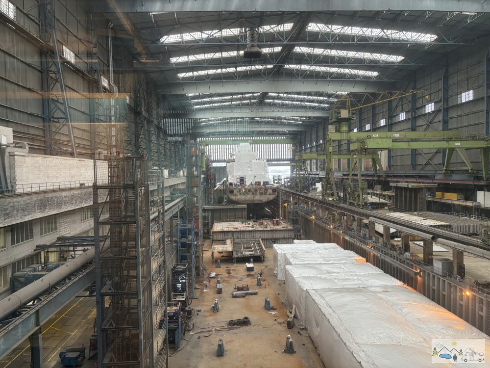 Zu guter Letzt besuchten wir noch die Herstellungshallen. Das heisst wir konnten durch Scheiben runter sehen. In der grossen Halle stand das Kreuzfahrtschiff Disney Destiny der Disney Cruise Line, wo die Fertigstellung im November 2025 sein soll. In der kleinen Halle stand, eines der zwei Versorgungsschiffe, die für die Marine erstellt werden, um zwei alte Schiffe zu ersetzen.